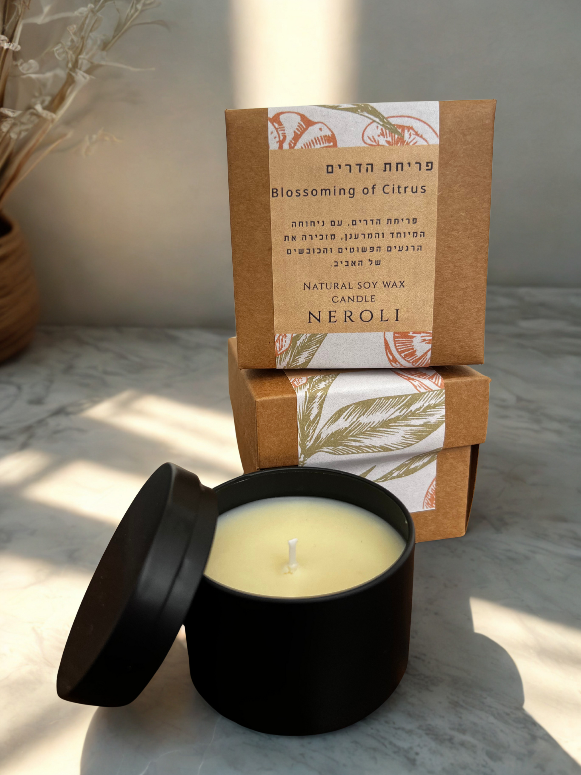 נר טבעי משעוות סויה, בעבודת יד, עם ניחוח עדין ורענן של פריחת הדרים. הריח הקליל והמתוק מזכיר את הרחובות הפורחים והשטופים באור השמש, וממלא את החלל בתחושת התחדשות ואופטימיות.